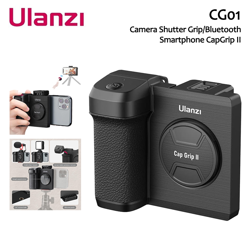 Spesifikasi: Model: Ulanzi CG01 CapGrip II Kompatibilitas Smartphone: Lebar 5.5 – 8.6 cm, layar ≥ 4.7” Koneksi: Bluetooth (jarak hingga ±2.5 m) Baterai: Internal rechargeable Pengisian daya: Port USB-C (kabel USB-C ke USB-A disertakan) Dudukan tambahan: Cold Shoe (atas), 1/4″-20 tripod mount (bawah) Fitur ekstra: Penutup lensa palsu dengan cermin…