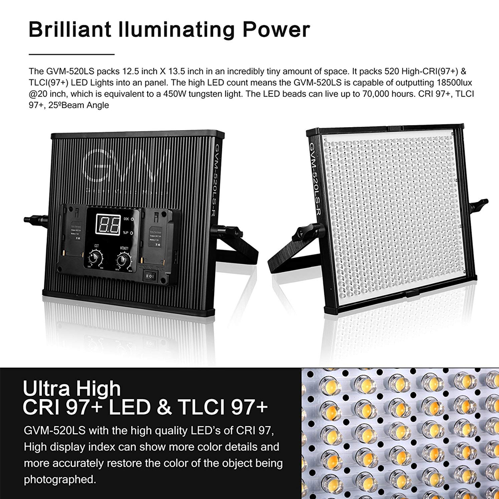 * LED Photography lighting with 520pcs durable LED bulbs, variable Tungsten-Daylight from 3200-5600K