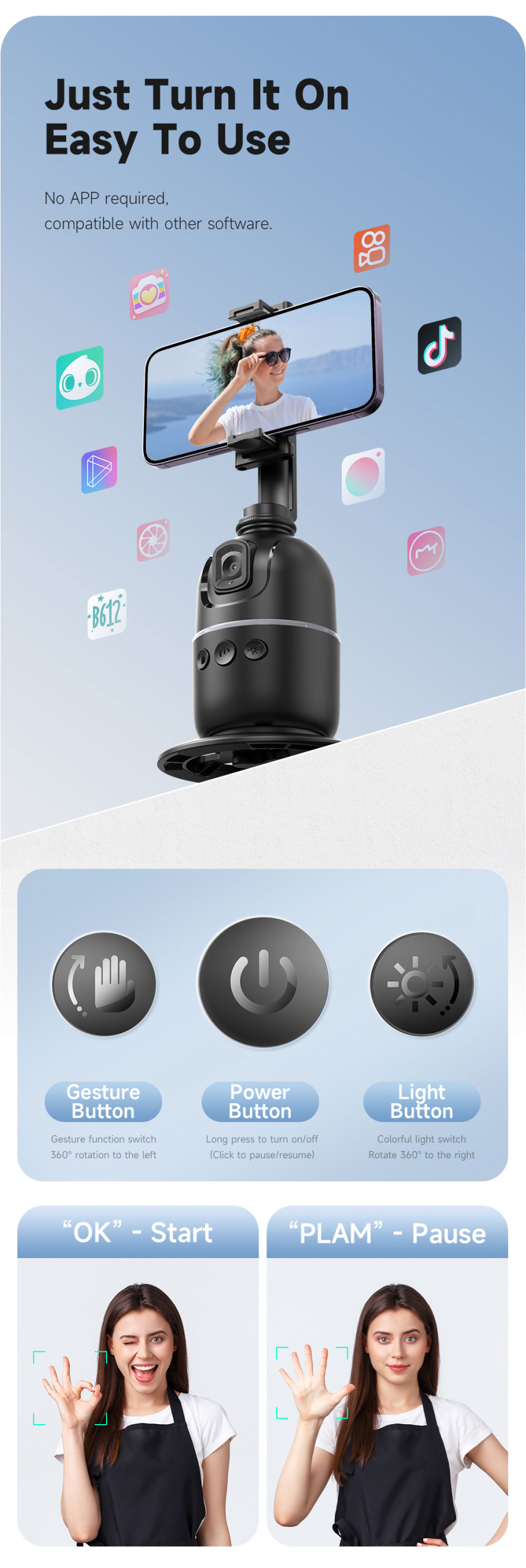 – Pengendalian gestur: “OK” untuk mulai, “Palm” untuk jeda, “Switch” untuk ganti subjek