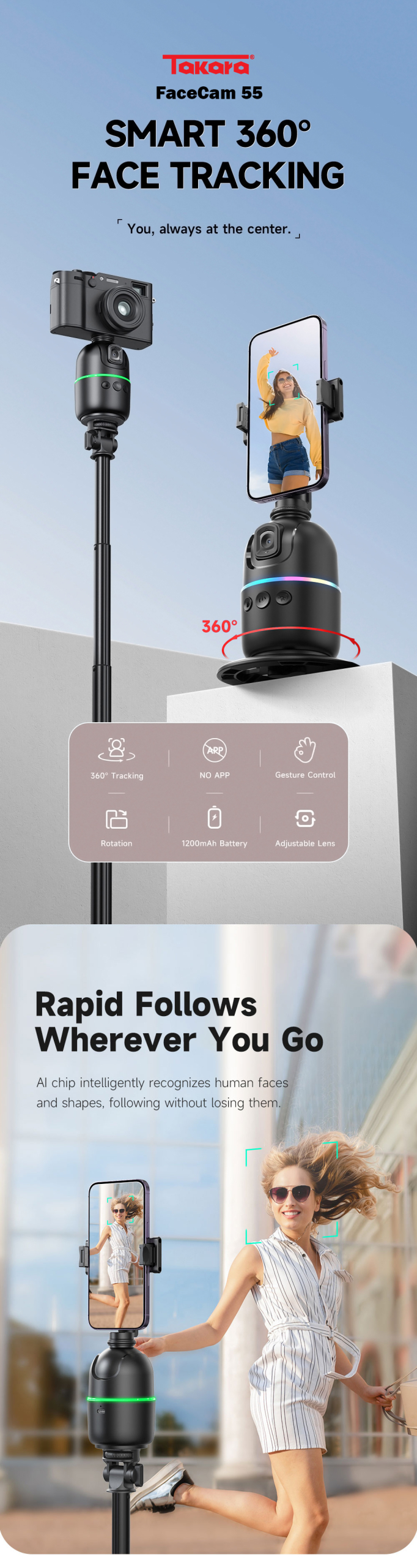 Takara FACECAM 55 Smart Ai Auto Face Tracking Gimbal Stabilizer for Camera & Smartphone