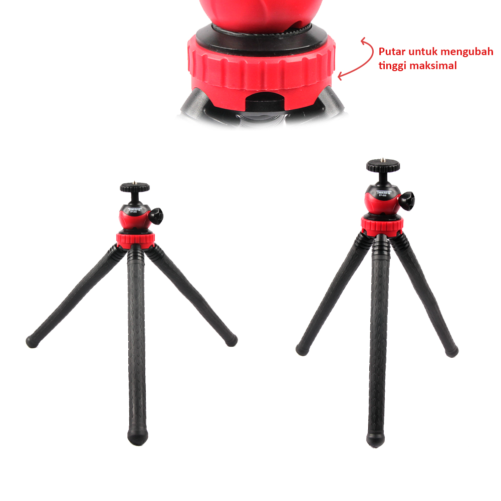 Tripod ini kompatibel dengan action camera, kamera pocket, DSLR, dan smartphone, serta sudah dilengkapi dengan mini ball head dan ulir universal 1/4 inci. Ball head-nya dapat dibongkar-pasang, memungkinkan pemasangan holder tambahan untuk penggunaan dengan smartphone.