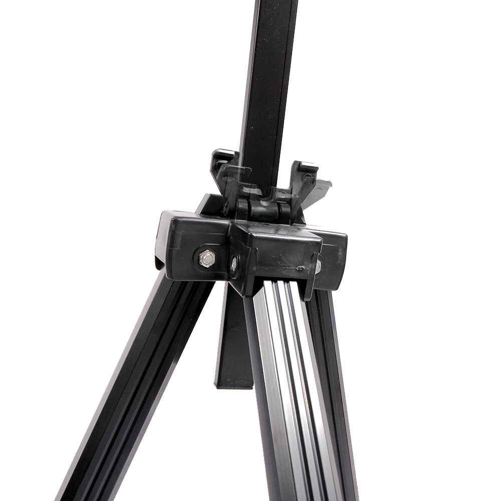 Kaki tripod terbuat dari aluminium ringan, sementara bagian engsel menggunakan plastik solid yang kuat dan tahan lama. Stand ini mudah dibawa ke berbagai lokasi karena desainnya yang compact saat dilipat dan sudah dilengkapi dengan tas penyimpanan. Proses pemasangan pun sederhana dan cepat, sangat praktis untuk keperluan display pameran, galeri, maupun event lainnya.