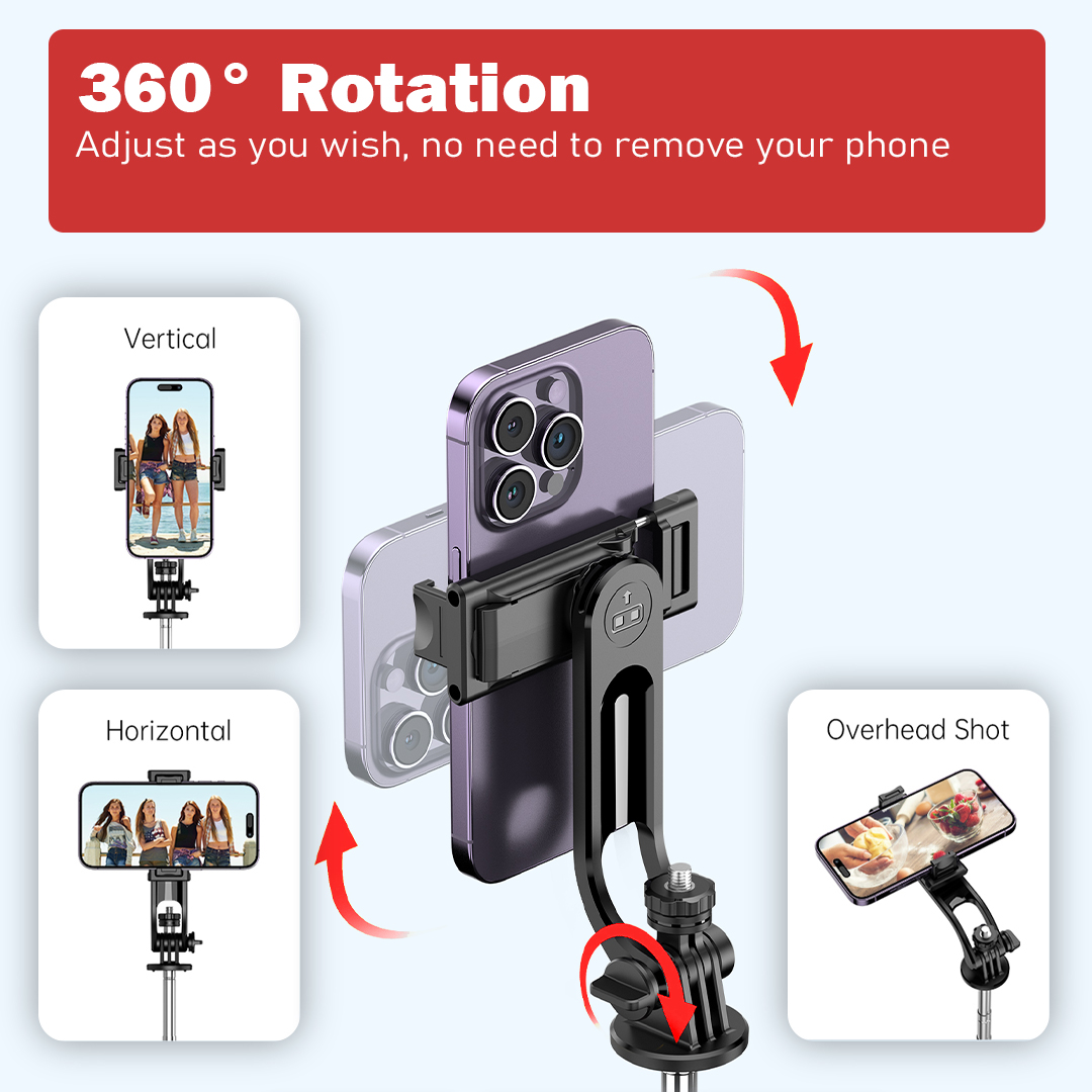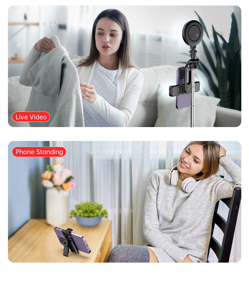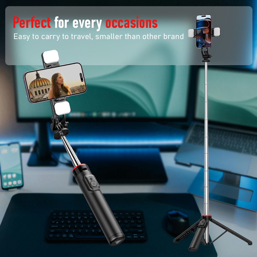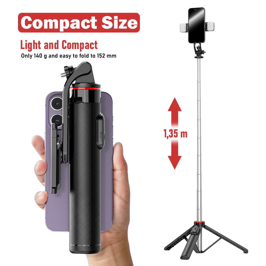 Dilengkapi dengan phone holder dan 2 lampu LED mini yang dapat dilepas, Anda bisa mengatur pencahayaan tambahan kapan pun dibutuhkan. Remote shutter bawaan memungkinkan pengambilan foto atau video jarak jauh hanya dengan sekali klik—cocok untuk pengguna Android maupun iOS.