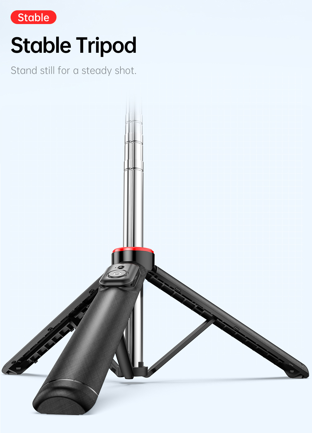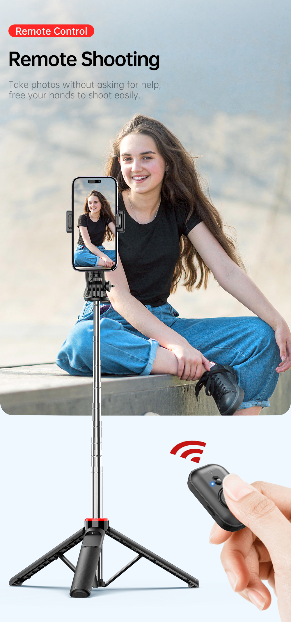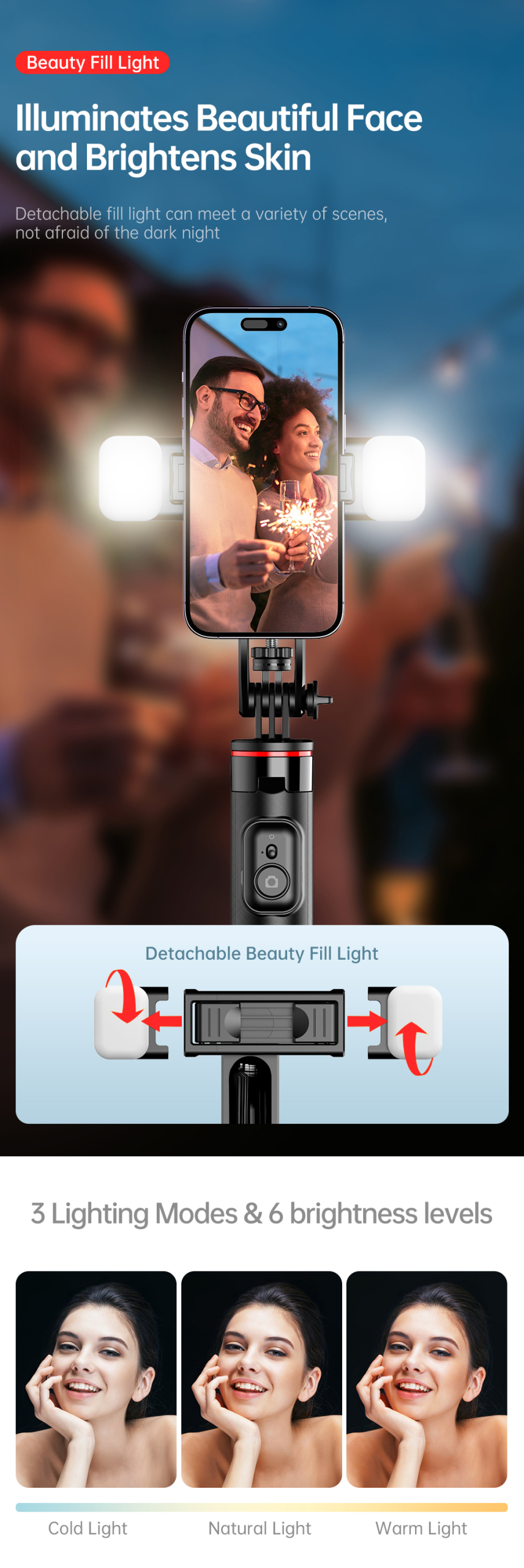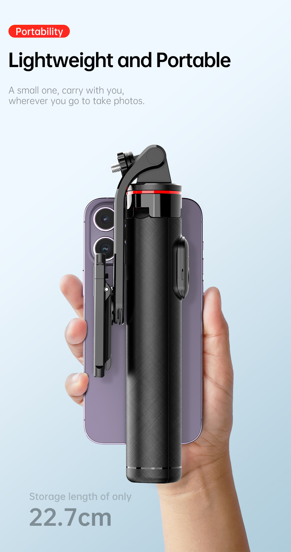 Dilengkapi dengan phone holder dan 2 lampu LED mini yang dapat dilepas, Anda bisa mengatur pencahayaan tambahan kapan pun dibutuhkan. Remote shutter bawaan memungkinkan pengambilan foto atau video jarak jauh hanya dengan sekali klik—cocok untuk pengguna Android maupun iOS.