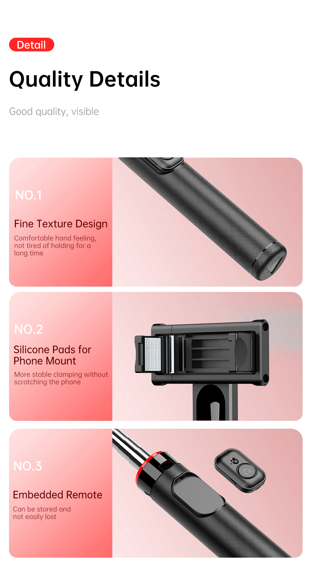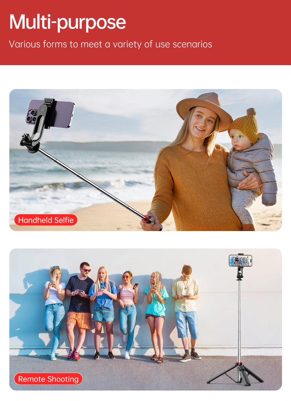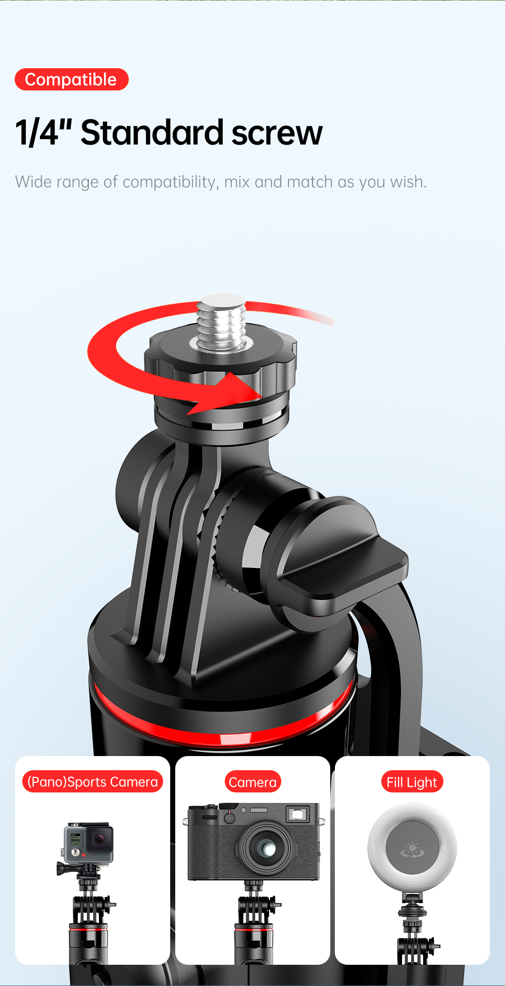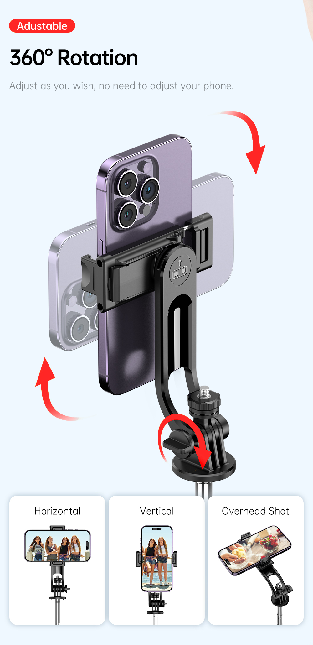Dilengkapi dengan phone holder dan 2 lampu LED mini yang dapat dilepas, Anda bisa mengatur pencahayaan tambahan kapan pun dibutuhkan. Remote shutter bawaan memungkinkan pengambilan foto atau video jarak jauh hanya dengan sekali klik—cocok untuk pengguna Android maupun iOS.