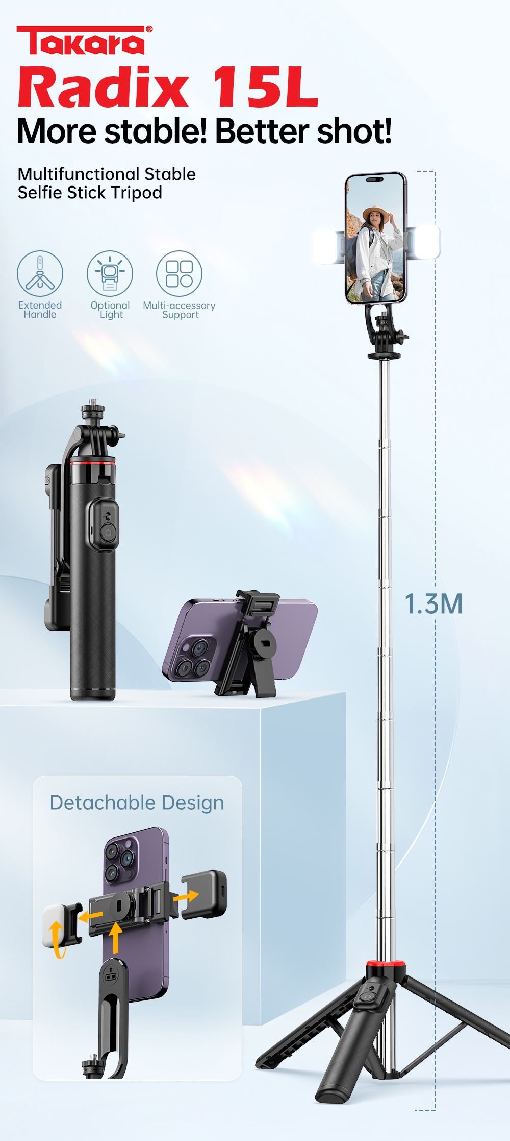 Takara Radix 15L adalah tripod selfie serbaguna dengan gagang teleskopik ultra-panjang dan desain ringan yang dapat dilipat, ideal untuk vlogging, selfie, live streaming, hingga kebutuhan dokumentasi harian. Dengan struktur tangguh berbahan ABS + stainless steel, Radix 15L memberikan kestabilan sekaligus portabilitas yang praktis.