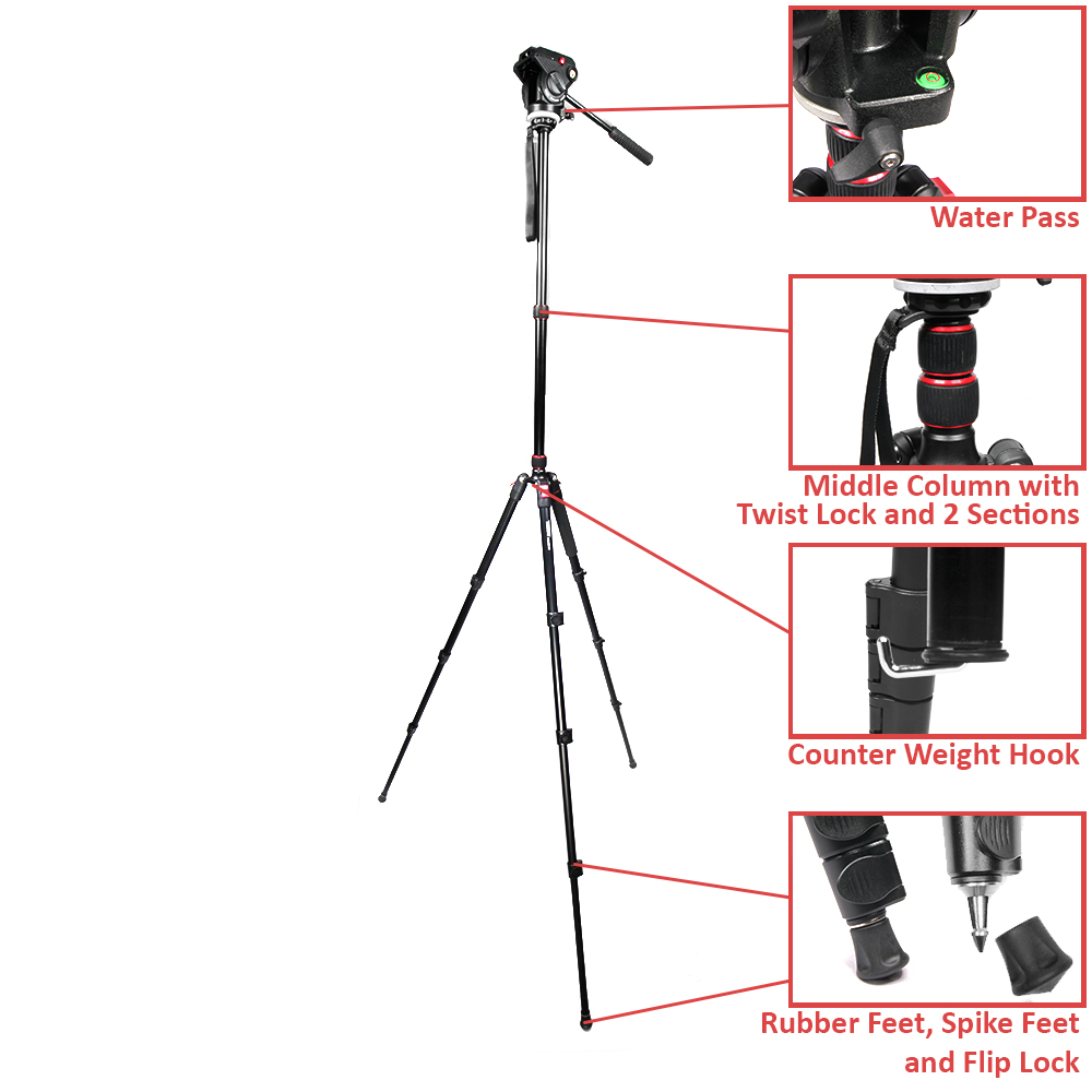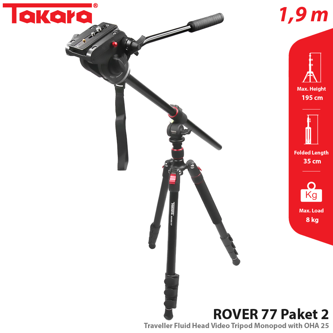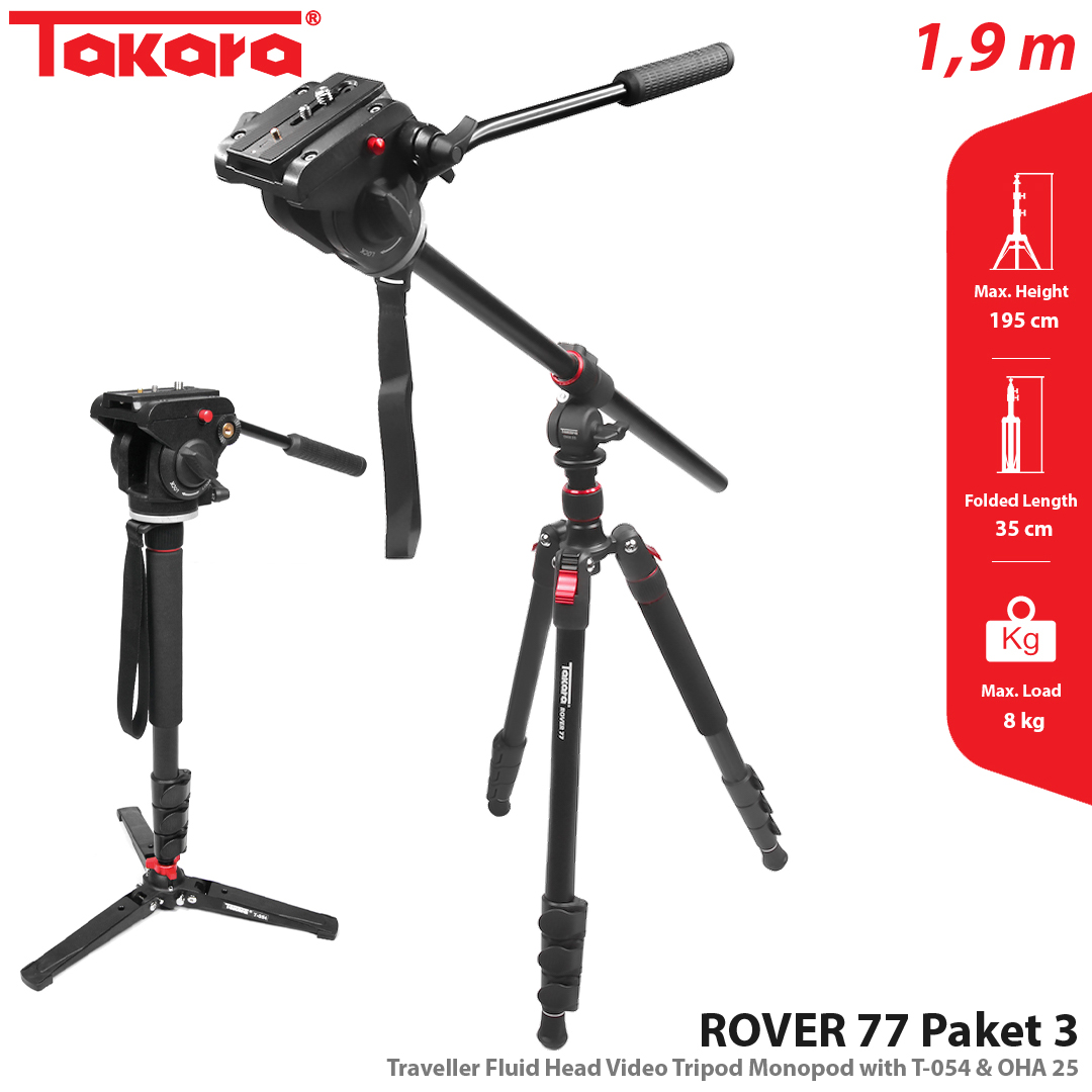 TAKARA Rover 77 merupakan 2 in 1 tripod monopod dengan desain yang compact namun professional sehingga mudah dibawa traveling kemanapun. Berbahan aluminium dengan Fluid video head metal menjamin ketahanan tripod dalam penggunaan sehari-hari. Fluid Video Head berbahan metal memberi keleluasaan bagi anda untuk menangkap gambar dan video dari berbagai angle yang sangat smooth, juga dilengkapi dengan QR Plate yang aman mempermudah anda untuk melepas kamera dari tripod atau monopod. Kaki tripod menggunakan desain flip lock yang compact, dengan rubber feet yang dapat dilepas menjadi spike feet agar lebih mudah digunakan pada lantai kontur tanah.