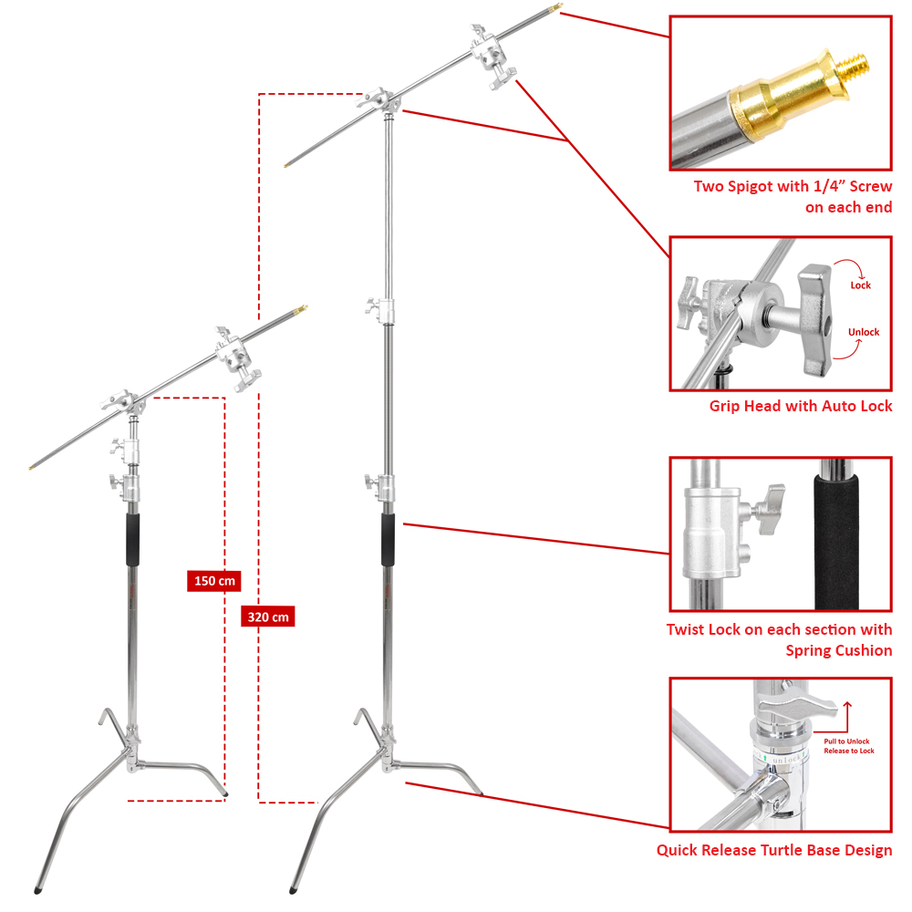 Dengan sistem Quick Release Turtle Base, kaki C-Stand dapat dilipat dan disimpan secara compact, namun tetap memberikan stabilitas maksimal saat digunakan. Pemasangan cepat dan mudah memungkinkan pengguna untuk menghemat waktu saat setup, bahkan hanya dengan satu tangan.