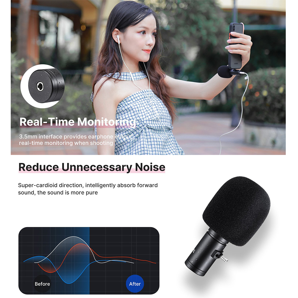 Ulanzi Sairen i Mic, solusi praktis untuk vloggers, livestreamers, videographers, maupun mobile journalists yang menginginkan audio lebih jernih daripada mikrofon bawaan perangkat iOS mereka. Dengan desain ultracompact, mikrofon ini langsung terhubung ke port Lightning tanpa perlu kabel tambahan atau mounting, sehingga sangat ringkas dibawa ke mana saja. Selain itu, tersedia jack headphone di bagian belakang untuk monitoring real-time, baik saat merekam maupun playback. Karena menggunakan daya langsung dari port Lightning (tanpa baterai), mikrofon ini siap digunakan kapan saja tanpa ribet. Pola pickup supercardioid memastikan fokus suara tetap pada objek di depan mikrofon, sekaligus meminimalisir kebisingan dari samping.