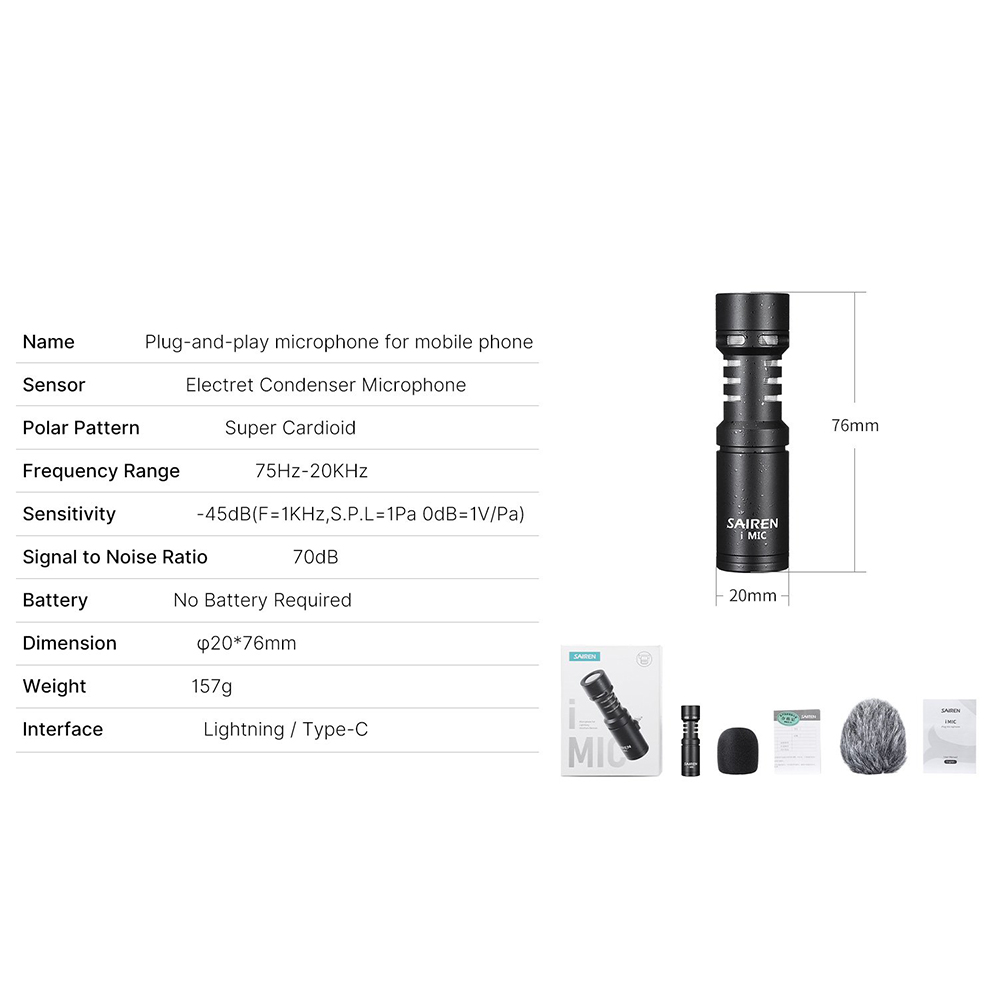 - 1x Ulanzi Sairen i Mic Plug & Play Microphone (Lightning Connector for iOS)